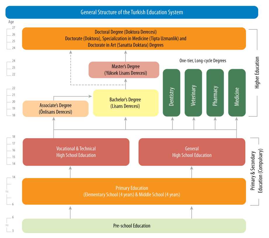 The basic structure of the Turkish National Education System consists of noncompulsory pre-school, compulsory primary, lower and upper secondary school, and higher education. The Republic of Turkey Ministry of National Education is the responsible body for pre-university education and the Council of Higher Education (YÖK) is the public authority for higher education