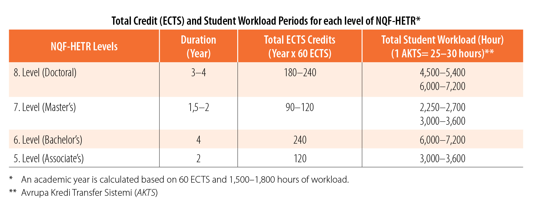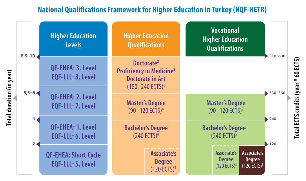 Higher education in Turkey consists of short, first, second, and third cycle degrees in terms of the terminology of the Bologna Process. The structure of Turkish higher education degrees is based on a two-tier system, except for dentistry, pharmacy, medicine and veterinary programs which have a one-tier system. The duration of these one-tier programs is five years (300 ECTS) except for medicine which lasts six years (360 ECTS). The qualifications in these one-tier programs are equivalent to the first cycle (bachelor’s) plus second cycle (master’s) degree. Undergraduate level of study consists of short cycle (associate’s / önlisans) and first cycle (bachelor’s / lisans derecesi) degrees which are awarded after successful completion of full-time two-year (120 ECTS) and four-year (240 ECTS) study programs, respectively.