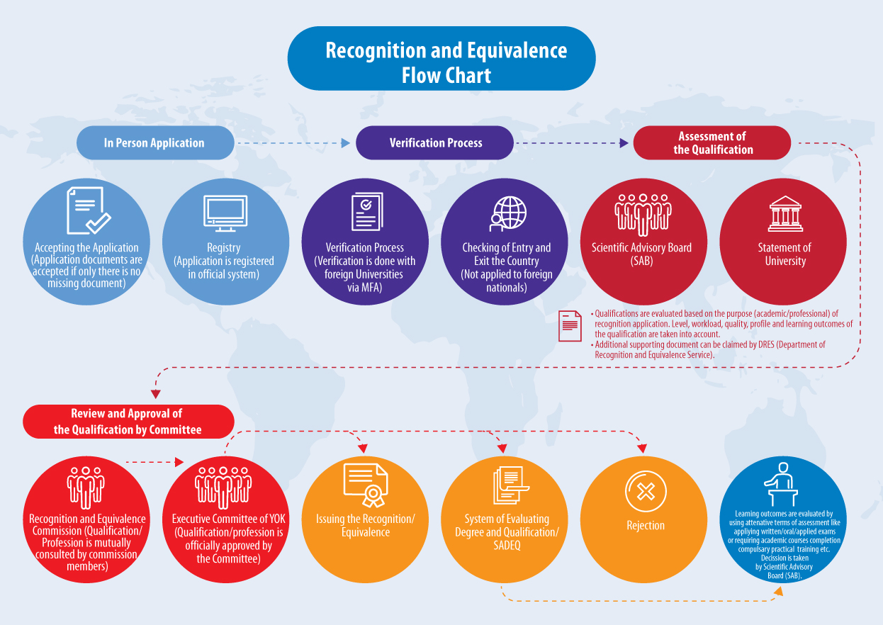 Services offered by DRES include ‘recognition’, which indicates that an overseas higher education institution is accepted as being authorized to give academic degrees, and ‘equivalence’, which indicates that qualifications at Associate degree, Bachelor’s and Master’s degree level received from recognized overseas higher education institutions are confirmed to be equivalent to the qualifications in Turkey.